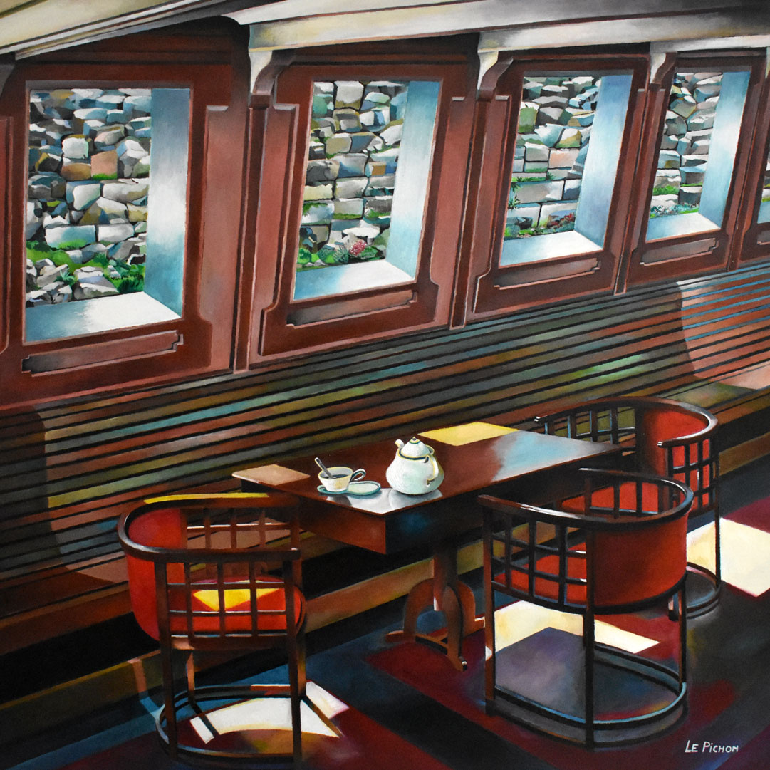 Pour ma dernière exposition au Salon Officiel des Beaux-Arts, j’ai choisi le tableau Tea Time issu de la série Nomadic. Cette huile sur toile de 100 x 100 cm date de 2016. Je l’ai peinte à la suite d’un voyage à Belfast au cours duquel j’ai visité le bateau Nomadic.